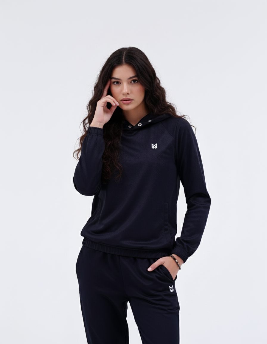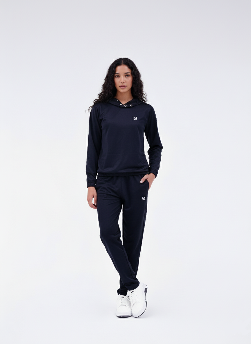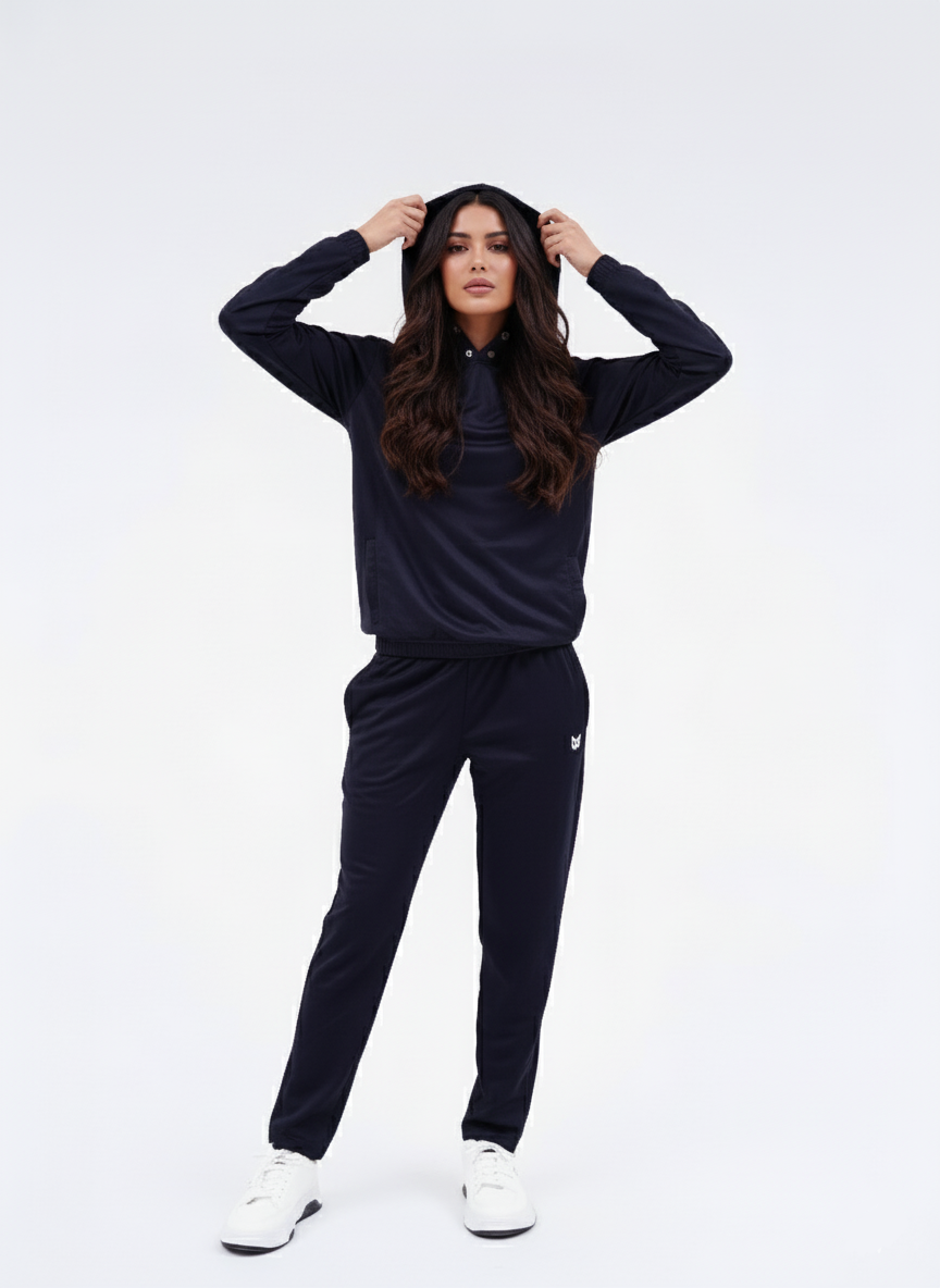 This coordinated two-piece set features a top (jacket or hoodie) and matching bottoms (joggers or trousers), but its standout detail is the Snap Button closure on the Hoodie. This unique feature allows you to customize the neckline snapping it closed for a high collar look, or leaving it open for a relaxed fit setting it apart from standard zip-ups or pullovers.